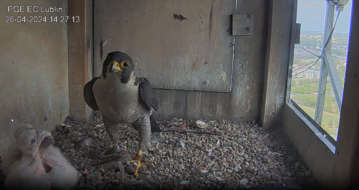 Wanda cały czas pilnuje piskląt w gnieździe i nie ma kiedy wylecieć na polowanie, ale jedzenia tu nigdy nie brakuje – Czajnik świetnie sobie radzi ze swoimi obowiązkami.